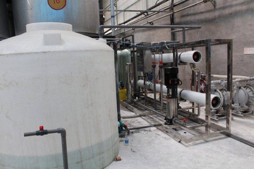 原水箱+石英砂+活性炭+阻垢設備+一級高壓泵+一級反滲透自動控制裝置+純凈水箱+管道壓力泵+拋光釉陶瓷用水箱。